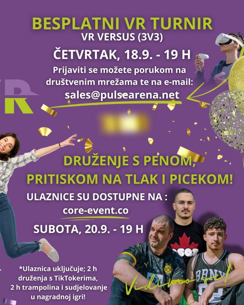 • U četvrtak 18. rujna, u 19 sati održat će se VR Esport Arena turnir (3v3) sa bogatim fondom nagrada. Vašu tročlanu ekipu možete prijaviti potpuno besplatno putem društvenih mreža Pulse Arene ili pozivom na broj 091 6373 189. Ekipe mogu biti muške, ženske ili mještovitog sastava.